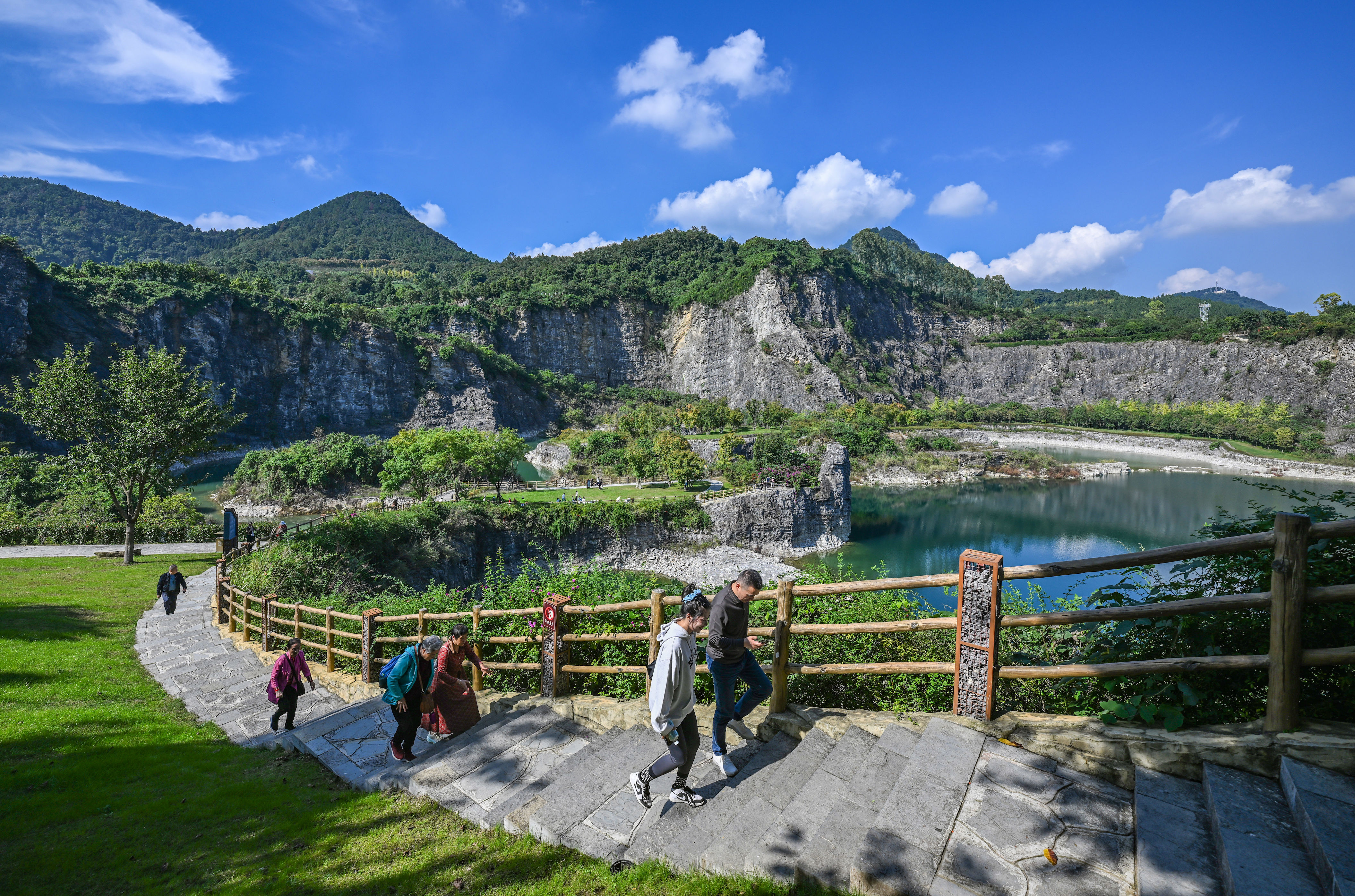 10月28日天朗气清,渝北区铜锣山矿山公园迎来众多市民。这里前身为石灰岩采矿区,经生态修复,废弃矿坑蜕变为生态景区。