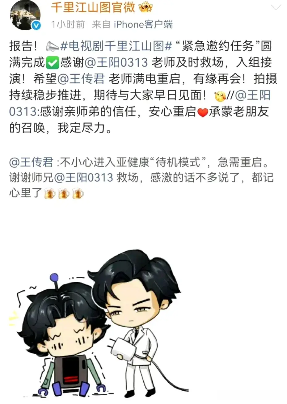 到了10点09分,剧组官微直接官宣换角完成,祝福王传君“满电重启”,同时明确拍摄“持续稳步推进”。