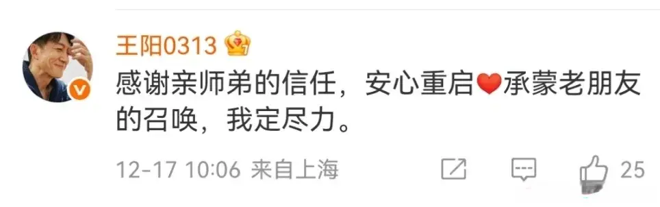 更绝的是后续衔接,6分钟后王阳就转发回应,一句“安心重启”精准呼应师弟的说法,还强调是“承蒙亲师弟信任、老朋友召唤”,既点出了同门情谊,也说明了救场的来龙去脉。
