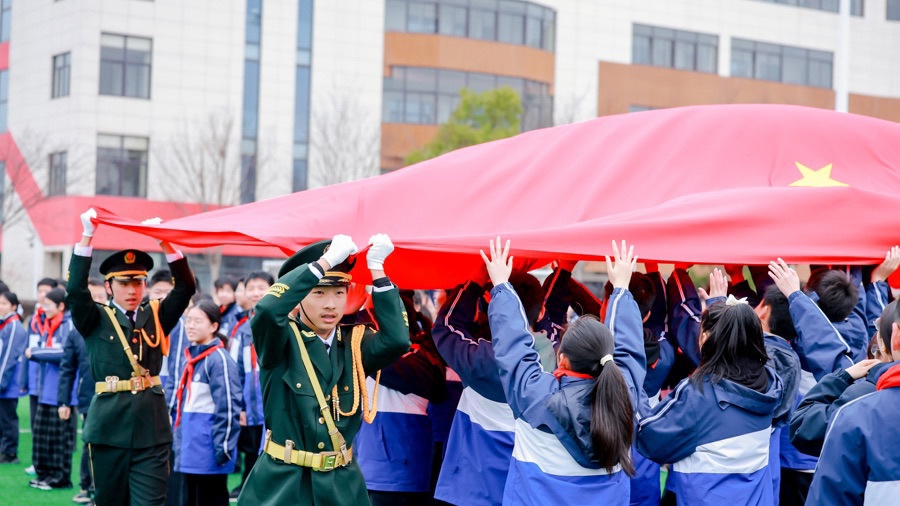 值得一提的是,当天上午,董立敢还走进思源中学,与全校师生共同参与“国旗在我心中”新学期升旗仪式。在他的亲自指挥下,学校国旗仪仗队队员步伐坚定地护送“中国第一旗”从同学们头顶缓缓经过,大家抬头仰望,与国旗完成了一次神圣的“零距离”接触。中国人民解放军仪仗司礼大队原空军分队长、抗战胜利80周年纪念活动阅兵教练员王杰作国旗下讲话,这场特别的升旗仪式,成为全校师生共同的红色记忆。